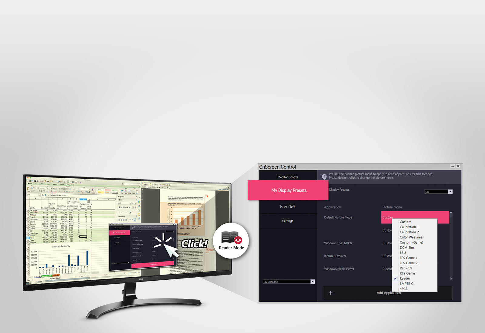 | Gotowe środowiska ustawień na Twoim ekranie Funkcja My Display Presets przypisuje wybrane ustawienia do konkretnych aplikacji, dzięki czemu nie musisz wybierać trybu kolorów po uruchomieniu każdego programu. Ponadto zawiera liczne gotowe tryby dla różnych środowisk.Różnorodne tryby kolorów – spełnią nawet najbardziej wyszukane oczekiwania profesjonalistów. |
