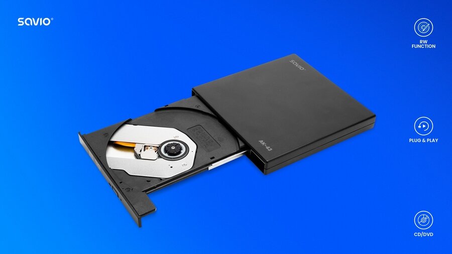 Zewnętrzny napęd - nagrywarka typu SLIM CD/DVD R/RW - USB jest to zewnętrzny napęd optyczny z interfejsem USB 2.0, który umożliwia odtwarzanie i nagrywanie nośników CD/DVD z prędkościami do 24x w przypadku płyt CD oraz do 8x dla płyt DVD. To kompaktowe urządzenie jest doskonałym wyborem dla użytkowników komputerów osobistych typu notebook, ultrabook oraz innego sprzętu, który nie jest wyposażony w nagrywarkę płyt CD/DVD. Napęd jest zasilany poprzez port USB, dodatkowo jest to urządzenie typu Plug & Play, kompatybilne z systemami Windows oraz MacOS.