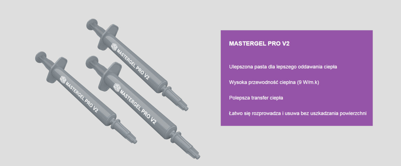 Wysoka przewodność cieplnaPasta MastergGel Pro V2 zapewnia wysoką przewodność cieplną na poziomie 9 W/M.K Łatwa aplikacjaPasta łatwo się rozprowadza i usuwa bez uszkadzania powierzchni | |