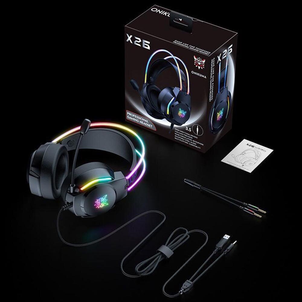 Onikuma X26 to słuchawki, które pozwolą Ci cieszyć się dźwiękiem najwyższej jakości, a także bezproblemową i czystą komunikacją głosową. Zostały one wyposażone w 50mm przetworniki stereo, co świetnie sprawdza się na wirtualnym polu walki, doskonale oddając wszystko to, co dzieje się wokół Twojego bohatera. Wbudowany mikrofon posiada funkcje redukcji szumów otoczenia, dzięki czemu masz pewność, że Twój głos jest wyraźny i niezagłuszany dźwiękami otoczenia. Onikuma X26 cechują się także niesamowitą wygodą, a wszystko za sprawą pałąka, który doskonale dopasowuje się do kształtu głowy, miękko wyściełane i ergonomiczne nauszniki świetnie przylegają do uszu.Zarówno sam pałąk, jak i słuchawki posiadają także podświetlenie RGB, co w wyjątkowy sposób podkreśla ich nowoczesny wygląd. W zestawie znajduje się także adapter 2x Mini Jack do 1x Mini Jack.