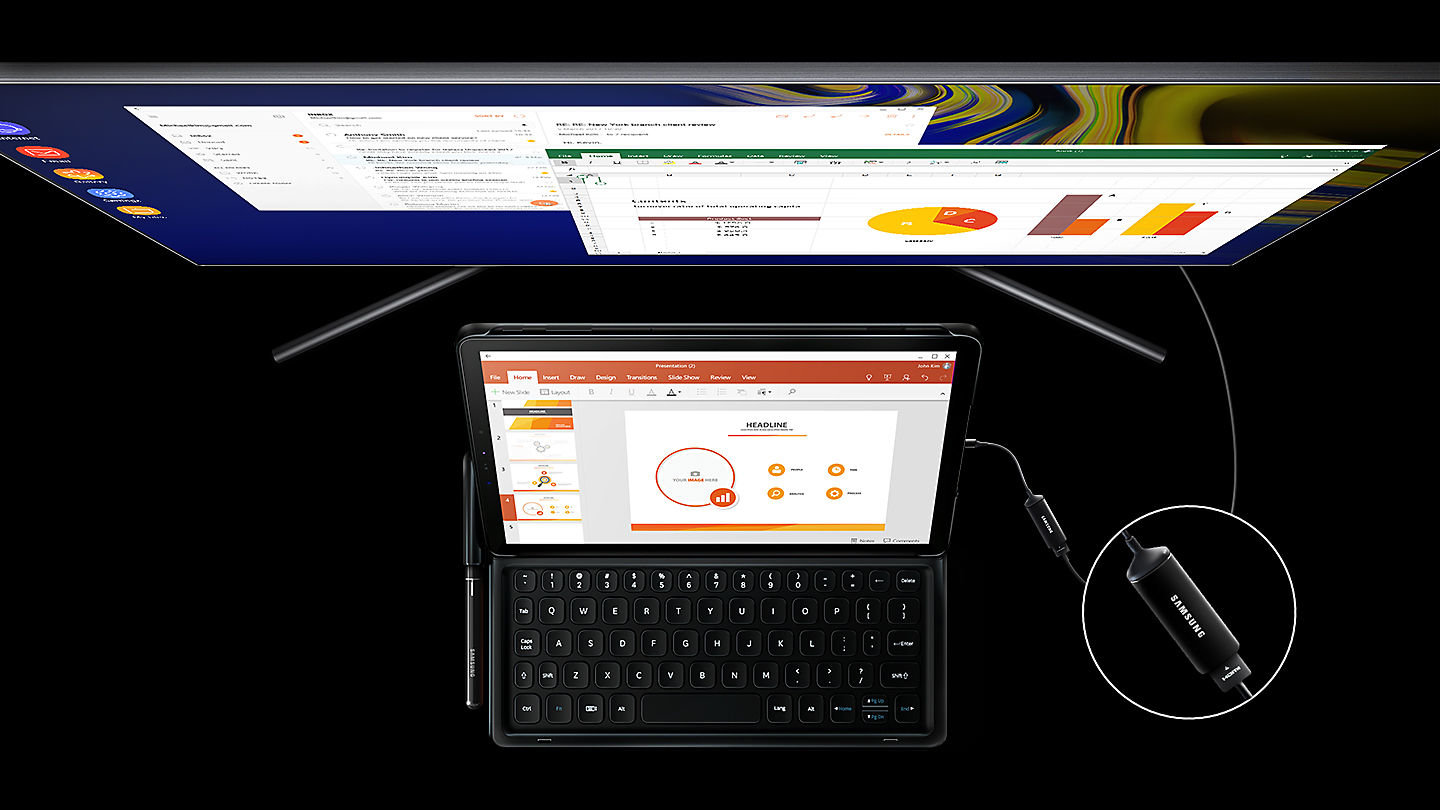 Galaxy Tab S4 to pierwszy tablet Samsung, na którym dostępny jest Samsung DeX. Ciesz się efektywnością komputera połączoną z mobilnością tabletu. Dodatkowo, za pomocą adaptera HDMI, z łatwością zrealizujesz wiele zadań jednocześnie, pracując na zewnętrznym monitorze bez korzystania ze stacji lub podkładki DeX. Możesz także zwiększyć efektywność, dodając klawiaturę bądź mysz.