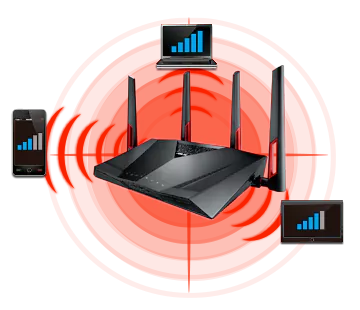 MU-MIMO zapewnia każdemu kompatybilnemu urządzeniu 8 własne, dedykowane połączenie Wi-Fi o pełnej prędkości, dzięki czemu można jednocześnie podłączyć kilka urządzeń, bez spowalniania sieci. W rzeczywistości, RT-AC88U ma możliwość podłączenia kilku kompatybilnych z MU-MIMO klientów z maksymalną prędkością każdego urządzenia jednocześnie, w przeciwieństwie do standardowych MIMO z pojedynczym użytkownikiem, gdzie poszczególne urządzenia muszą czekać na kolejne transmisje.