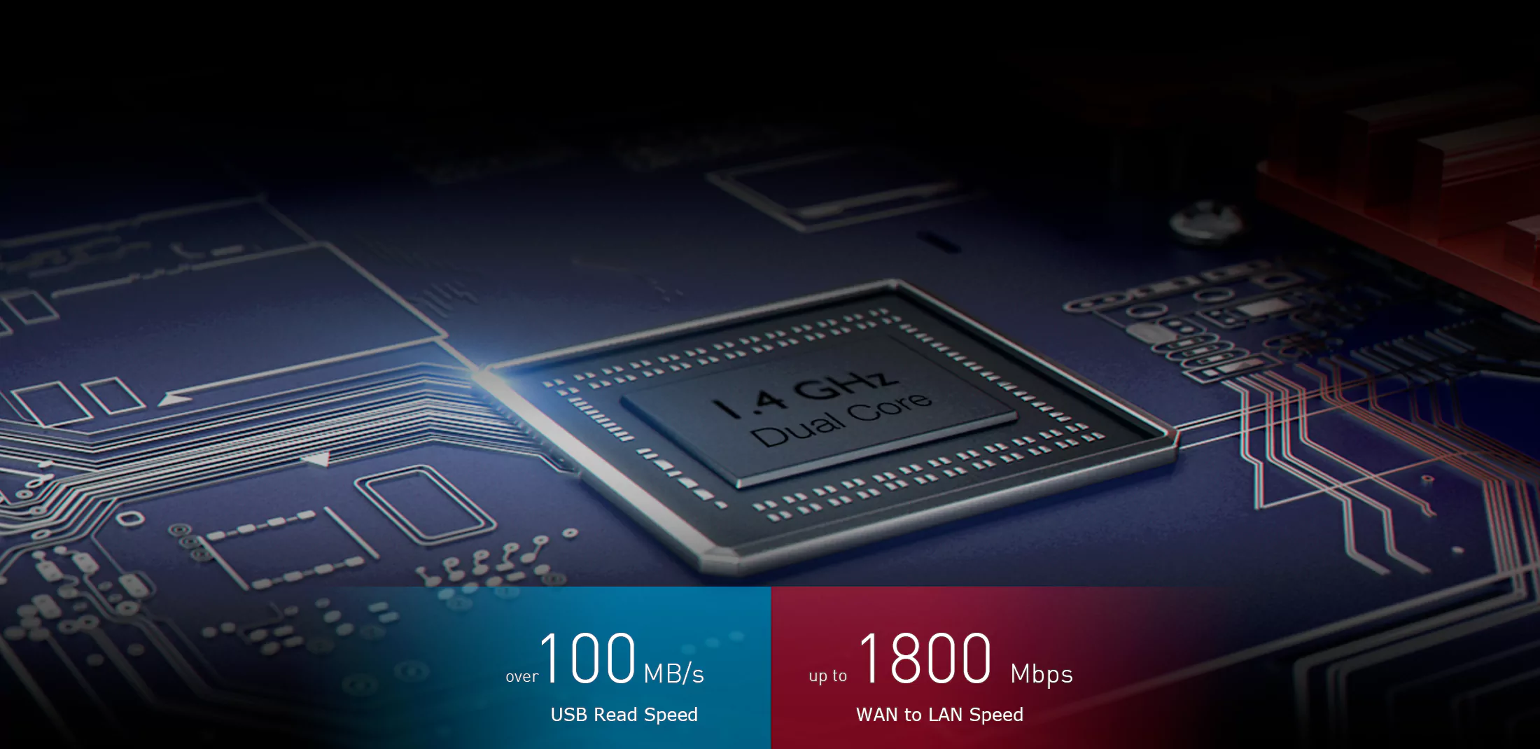 Najdroższy w swojej grupie dwurdzeniowy procesor 1,4 GHz zastosowany w routerze RT-AC88U, wynosi jego możliwości obliczeniowe na wyższy poziom. Transfer danych USB to ponad 100 MB/s, a prędkość pobierania/wysyłania (przepustowość sieci WAN-LAN) to nawet 1800 Mb/s. ![]() Nawet 4 x większa pojemność