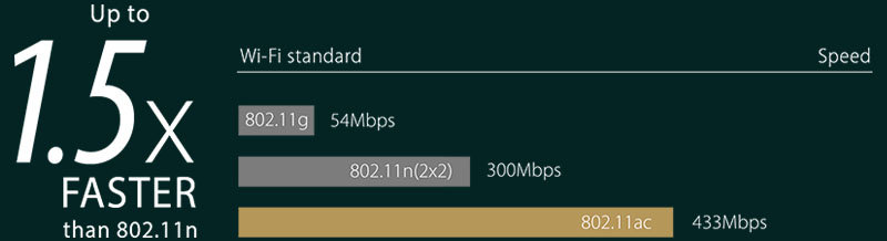 Napędzany nowym chipsetem 802.11ac, router RP-AC51 oferuje superszybkie bezprzewodowe połączenie AC, z prędkościami rzędu nawet 433 Mbps na paśmie 50 GHz – czyli około 1,5 razy szybciej niż bezprzewodowe połączenie w standardzie N. Dzięki temu wysokowydajnemu Wi-Fi możesz cieszyć się płynną rozgrywką online, surfowaniem po sieci i innymi zadaniami, które wymagają dużej przepustowości sieci – a wszystko to bez kabli.