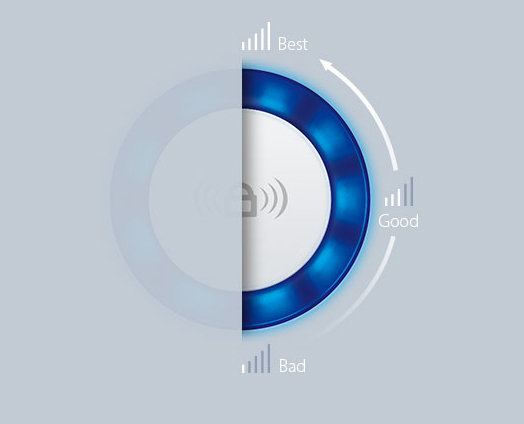 | Wskaźnik siły sygnału Wzmacniacz wyposażony jest w 5 diod pokazujących siłę odbieranego sygnału sieci bezprzewodowej, co pomaga określić odpowiednią lokalizację do umieszczenia urządzenia dla osiągnięcia największego zasięgu i wydajności połączeń bezprzewodowych. Dla optymalnej pracy, zaleca się umieszczenie wzmacniacza w miejscu, w którym zapalone są przynajmniej 3 niebieskie diody. |