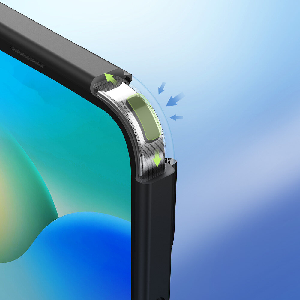 Zastosowano połączenie krawędzi z miękkiego TPU oraz panelu, wykonanego z poliwęglanu, który jest odporny na wstrząsy, uderzenia i upadki