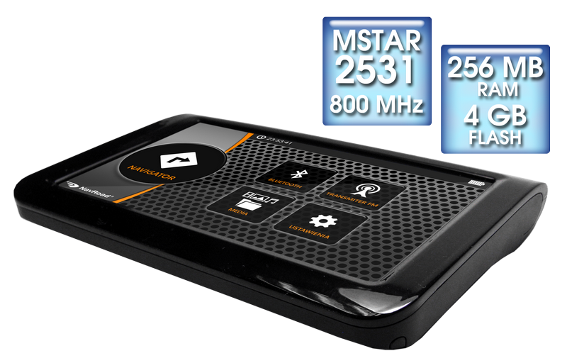 | Sprawdzony procesor MStar 2531 taktowany jest częstotliwością 800MHz, zapewnia płynną pracę nawigacji i szybkie wytyczanie trasy. Dodatkowym wsparciem dla procesora jest 256 MB pamięci RAM, która przekłada się na jeszcze szybsze wytyczanie oraz korektę nawet długich tras w najpopularniejszych programach nawigacyjnych. Wewnętrzną pamięć FLASH o pojemności 4 GB można rozszerzyć o dodatkowe 32 GB za pomocą karty microSD/SDHC (brak w zestawie), dzięki czemu w NavRoad X5 można korzystać naprzemiennie z kilku ulubionych programów nawigacyjnych, które mogą być wyposażone w różne mapy i dodatki. W X5 jest to bajecznie proste, bowiem swobodę wyboru daje specjalnie zaprojektowany interfejs głównego menu urządzenia. | ![]() |