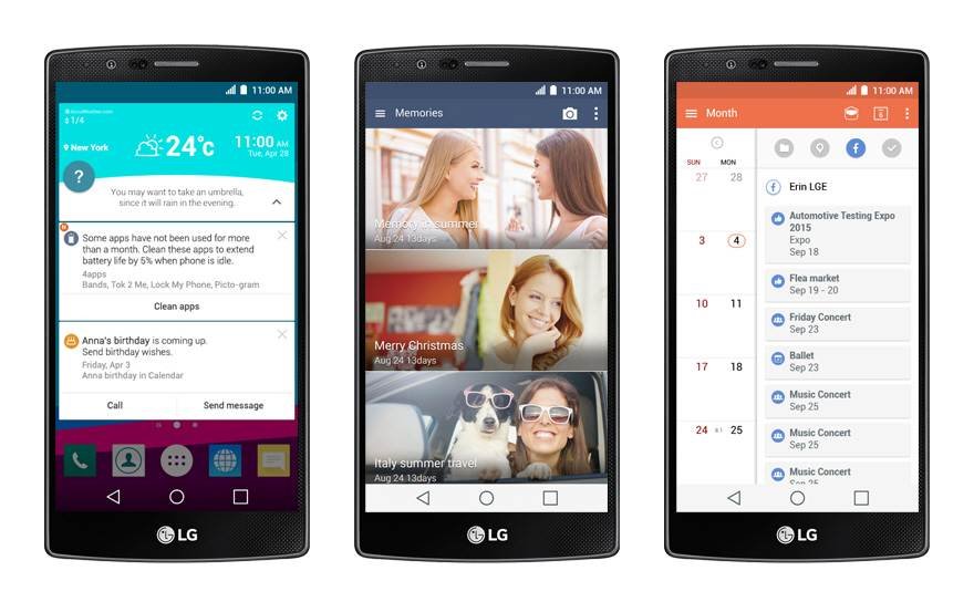 Smart Notice - Inteligentne powiadomieniaUłatwiają życie na wiele sposobów. Pozwalają na zautomatyzowanie codziennych zadań, zapewniają dostęp do inteligentnych podpowiedzi Smart FAQ, dzięki którym odkryjesz wszystkie funkcje smartfona G4. Smart Notice wyświetli spersonalizowane wskazówki dotyczące pogody, podróżowania oraz inne przydatne powiadomienia.GaleriaTeraz galerię zdjęć można przeglądać szybciej niż kiedykolwiek dotąd, ponieważ nowy interfejs porządkuje zdjęcia według daty oraz miejsca wykonania, a ponadto jest wyposażony w funkcje wyszukiwania według daty oraz okazjonalnego przypominania miło spędzonych chwil. Inteligentny kalendarzInformacje o wydarzeniach można łatwo kopiować do kalendarza metodą „przeciągnij i upuść”. Wówczas, na ich podstawie, funkcja Event Pocket wyświetli sugestie dotyczące miejsc oraz spraw do załatwienia.