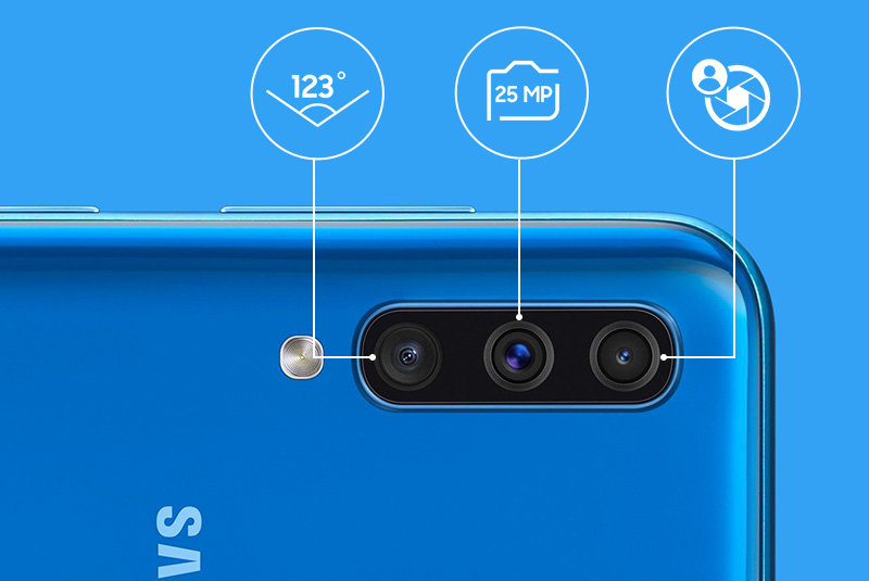 Samsung Galaxy A50 posiada idealny przedni aparat do selfie o matrycy 25 MP oraz trzy aparaty tylne: główny szerokokątny o rozdzielczości 25 MP, ultraszerokokątny obejmujący pole widzenia o kącie 123° (8 MP) oraz obiektyw głębi (5 MP).