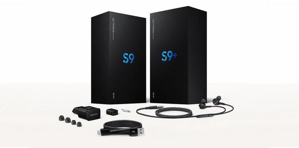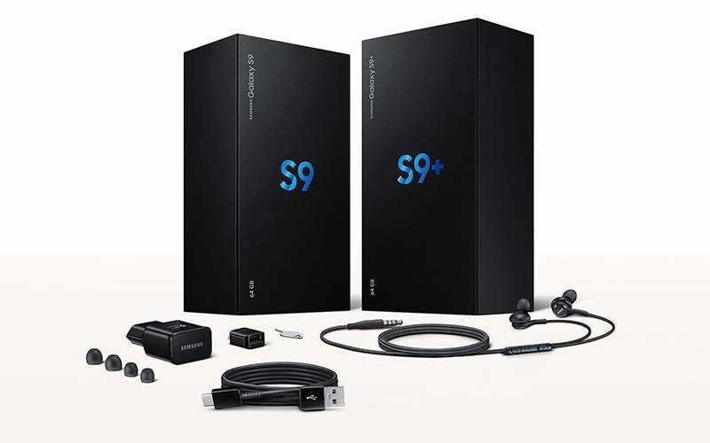 Elementy w zestawie: Telefon Galaxy S9+, kabel USB, słuchawki douszne by AKG, igła do karty SIM, zasilacz USB, przejściówka USB typu C, przejściówka micro USB, ulotka połączenia USB, instrukcja obsługi.
