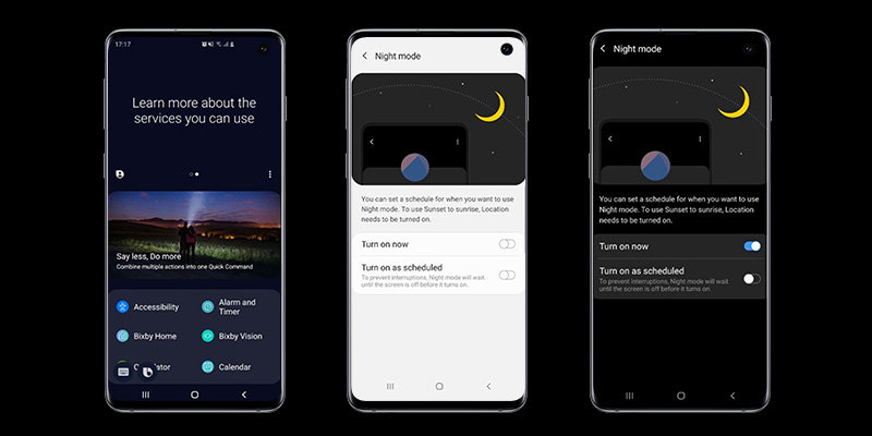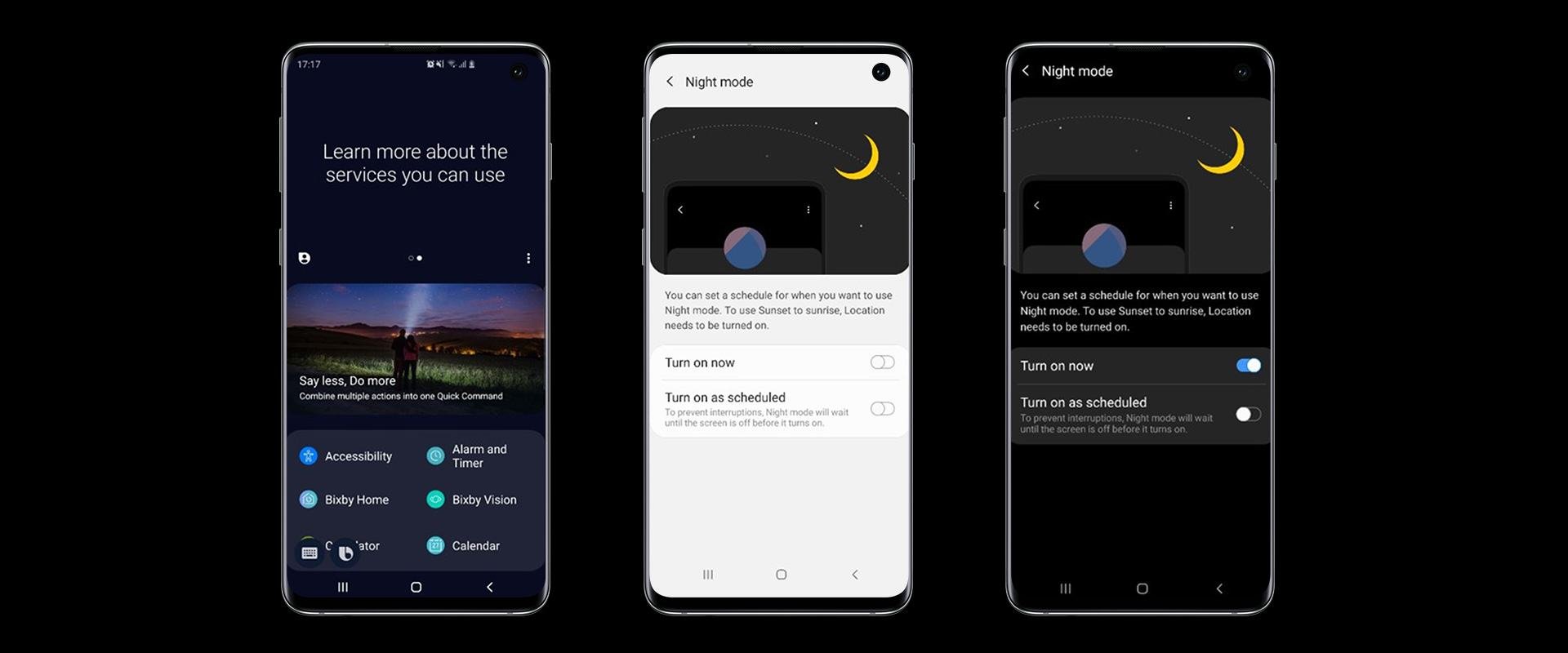Nowy i odświeżony interfejs One UI stawia przed Tobą zupełnie nowe możliwości. Od teraz możesz cieszyć się doskonałym zorganizowaniem przestrzeni roboczej. Ekran w górnej części wyświetli ważne i istotne informacje, a w dolnej umożliwi interakcję z elementami UI. Wszystko to sprawia, że możesz do woli korzystać ze smartfonu za pomocą jednej ręki. Do poprawy komfortu przyczynia się Tryb Nocny, który zmienia kolory na ciemniejsze, jednocześnie oszczędzając baterię i chroniąc wzrok.