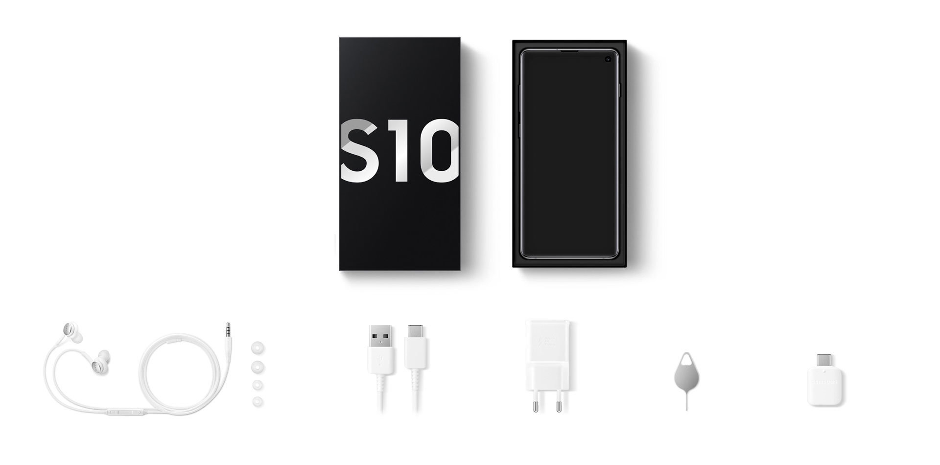 W zestawie znajdziesz: telefon Galaxy S10, kabel USB, słuchawki douszne by AKG, igła do karty SIM, zasilacz USB, przejściówka USB typu C, przejściówka micro USB, instrukcja obsługi.