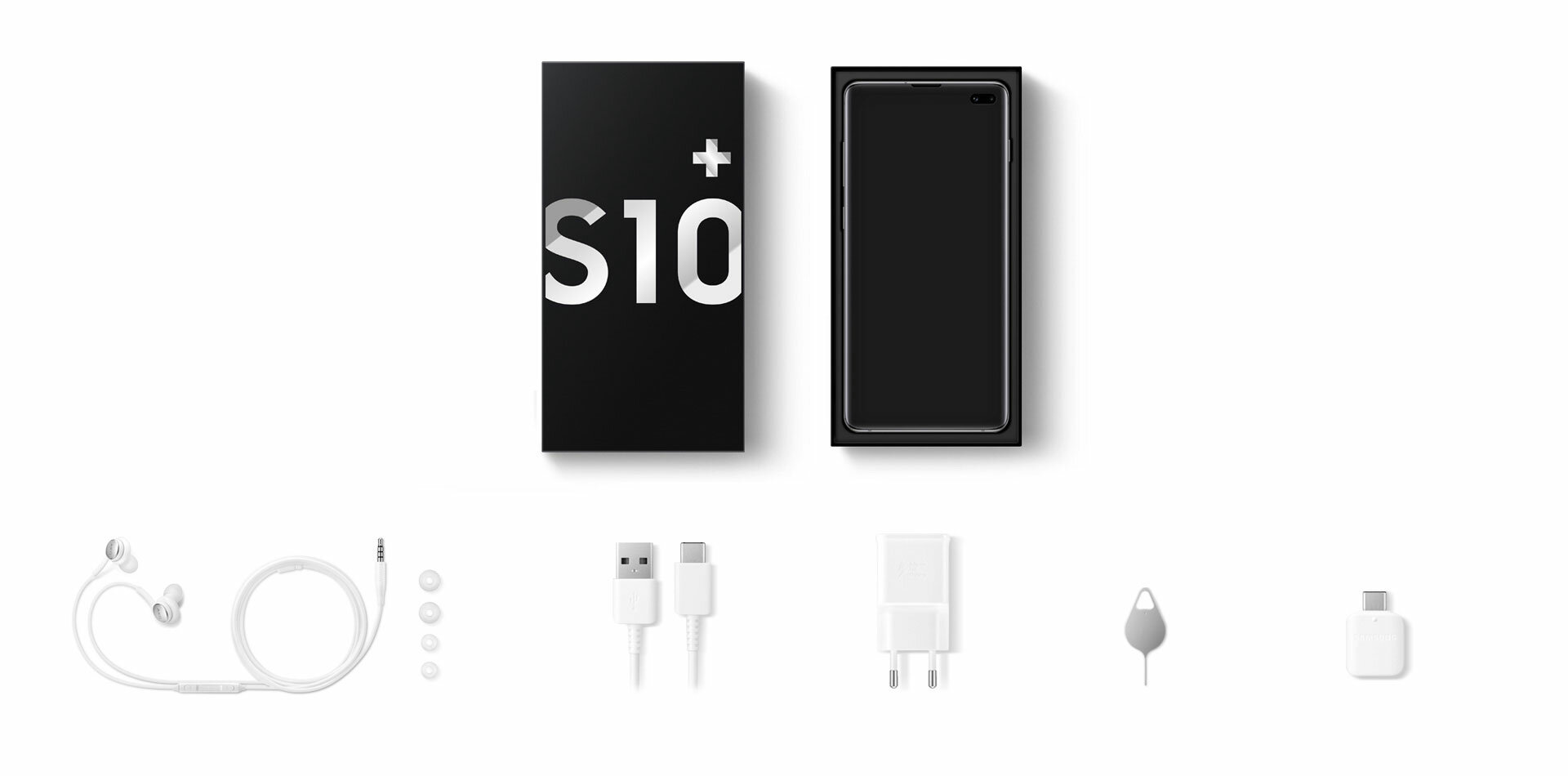 W zestawie znajdziesz: telefon Galaxy S10+, kabel USB, słuchawki douszne by AKG, igła do karty SIM, zasilacz USB, przejściówka USB typu C, przejściówka micro USB, instrukcja obsługi.
