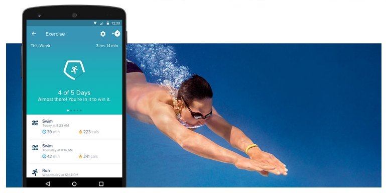 | Swim-Proof Automatyczne śledzenie pływania, a następnie podsumowanie ćwiczeń w aplikacji Fitbit. |
