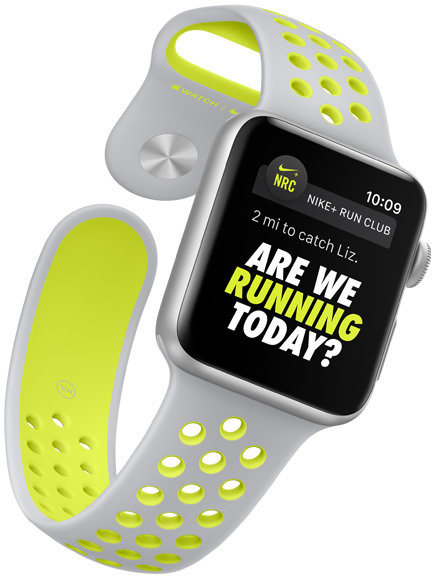Specjalne tarcze Nike. W zaprojektowanych specjalnie dla Apple Watch tarczach Nike użyto kultowego, jaskrawego zielonożółtego koloru Nike, a czas wyświetlany jest w stylu analogowym i cyfrowym. Każda ma także komplikację do uruchamiania apki Nike+ Run Club. |