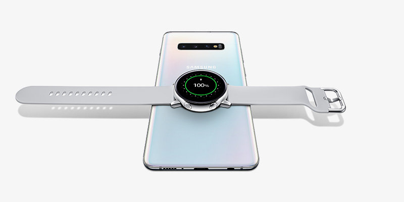 Teraz w nagłym wypadku, gdy bateria w Twoim smartwatchu rozładuje się niespodziewanie, możesz ją łatwo podładować indukcyjnie. Wystarczy, że przyłożysz Galaxy Watch Active do tyłu obudowy Galaxy S10 i zaraz możesz kontynuować trening. Możesz także naładować zegarek za pomocą ładowarki bezprzewodowej.