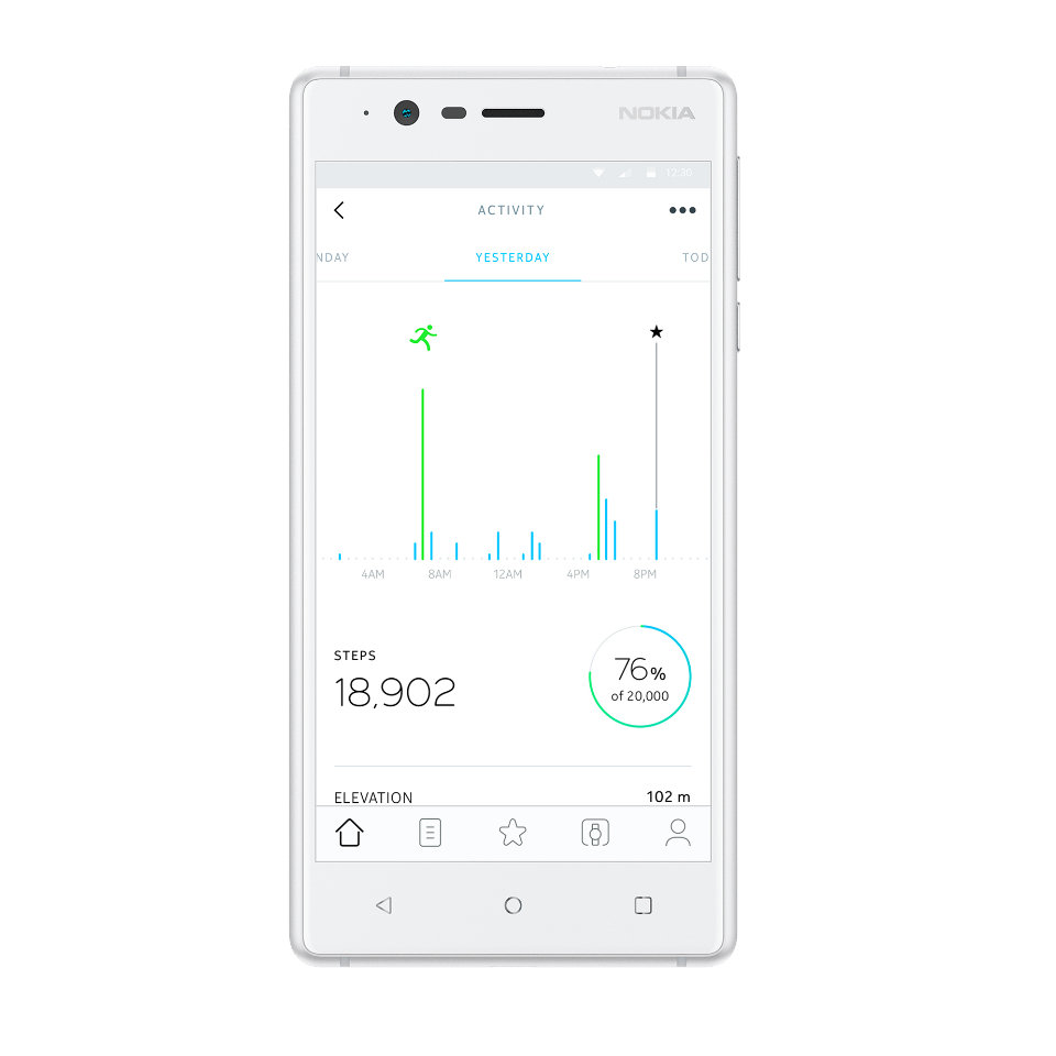 Obserwuj trendy & analizuj dane Nokia Steel automatycznie synchronizuje się z telefonem, dzięki czemu możesz śledzić wszystkie postępy w darmowej aplikacji Health Mate. Aplikacja oferuje profesjonalne wskazówki na każdym kroku (Activity Insights), tablicę z wynikami znajomych oraz przypomnienia, które pomogą Ci osiągnąć założone. |