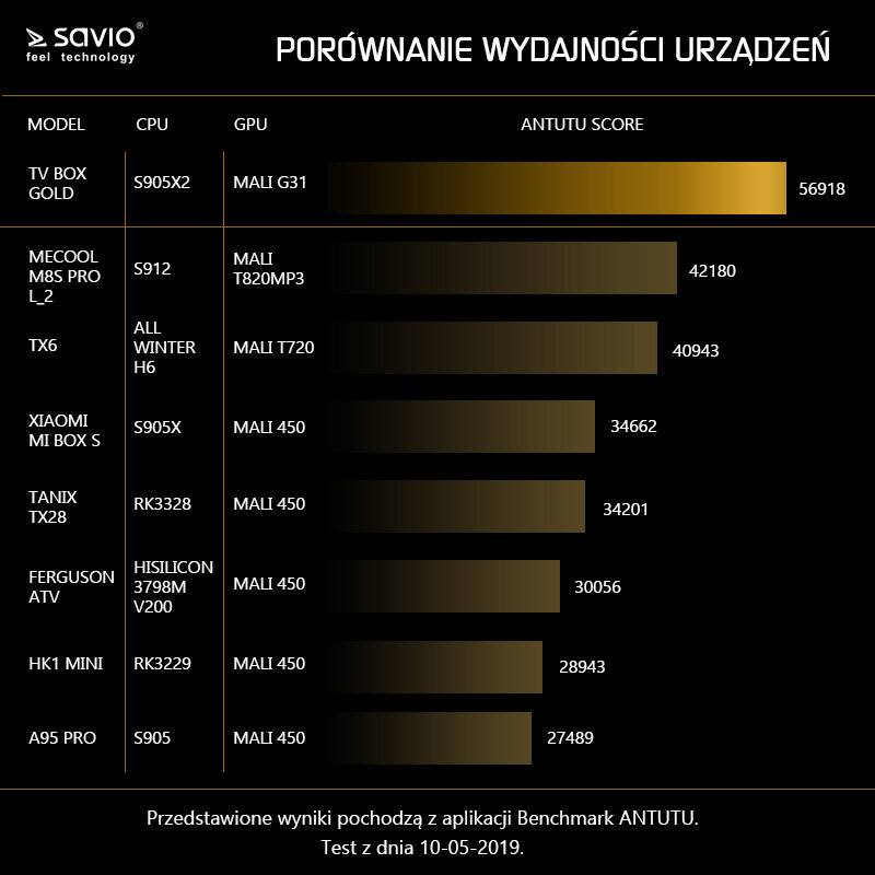 SAVIO SMART TV BOX GOLD jest wsparty procesorem Amlogic S905X2, pamięcią 2GB RAM oraz 16GB ROM. Dzięki takiemu rozwiązaniu użytkownik ma możliwość zainstalowania dowolnych aplikacji dostępnych w sklepie Google Play i cieszenia się ich szybką i płynną pracą. Obraz w rozdzielczości 4K, najpopularniejsze aplikacje i przede wszystkim jeszcze wyższa wydajność – to wszystko możesz mieć, korzystając z SAVIO SMART TV BOX GOLD.