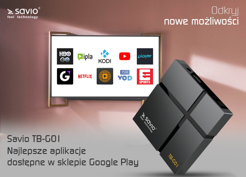 Przystawka do telewizora lub monitora SAVIO SMART TV BOX GOLD to genialny odtwarzacz multimedialny i domowe centrum rozrywki. Dzięki temu urządzeniu uzyskasz dostęp do gier, wiadomości, ulubionych programów telewizyjnych czy podcastów. System Android 9.0 Pie umożliwi Tobie skorzystanie z serwisów YouTube, Netflix, IPLA, TVP VOD i tysięcy innych z Polski oraz zagranicy.