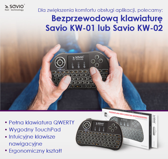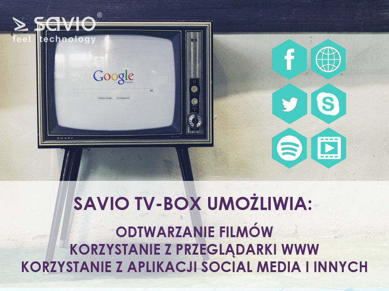Savio TV-Box to rewelacyjne urządzenie, które po wpięciu do telewizora sprawia, że nawet najstarszy model staje się SMART! Możliwość korzystania z wyszukiwarki internetowej, najlepsze aplikacje: Netflix, YouTube, Skype, Twitter, Kodi, HBO GO i wiele innych dostępnych w sklepie Google Play. Ponadto Savio TV-Box pozwala na odtwarzanie muzyki, zdjęć czy filmów, a nawet gier. Dzięki aplikacji Miracast bez problemu możesz wyświetlić obraz ze swojego smartfona na ekranie telewizora. Intuicyjne menu, po którym możesz się poruszać za pomocą pilota, klawiatury lub myszy komputerowej. To wszystko i jeszcze więcej, dzięki Savio TV-Box.