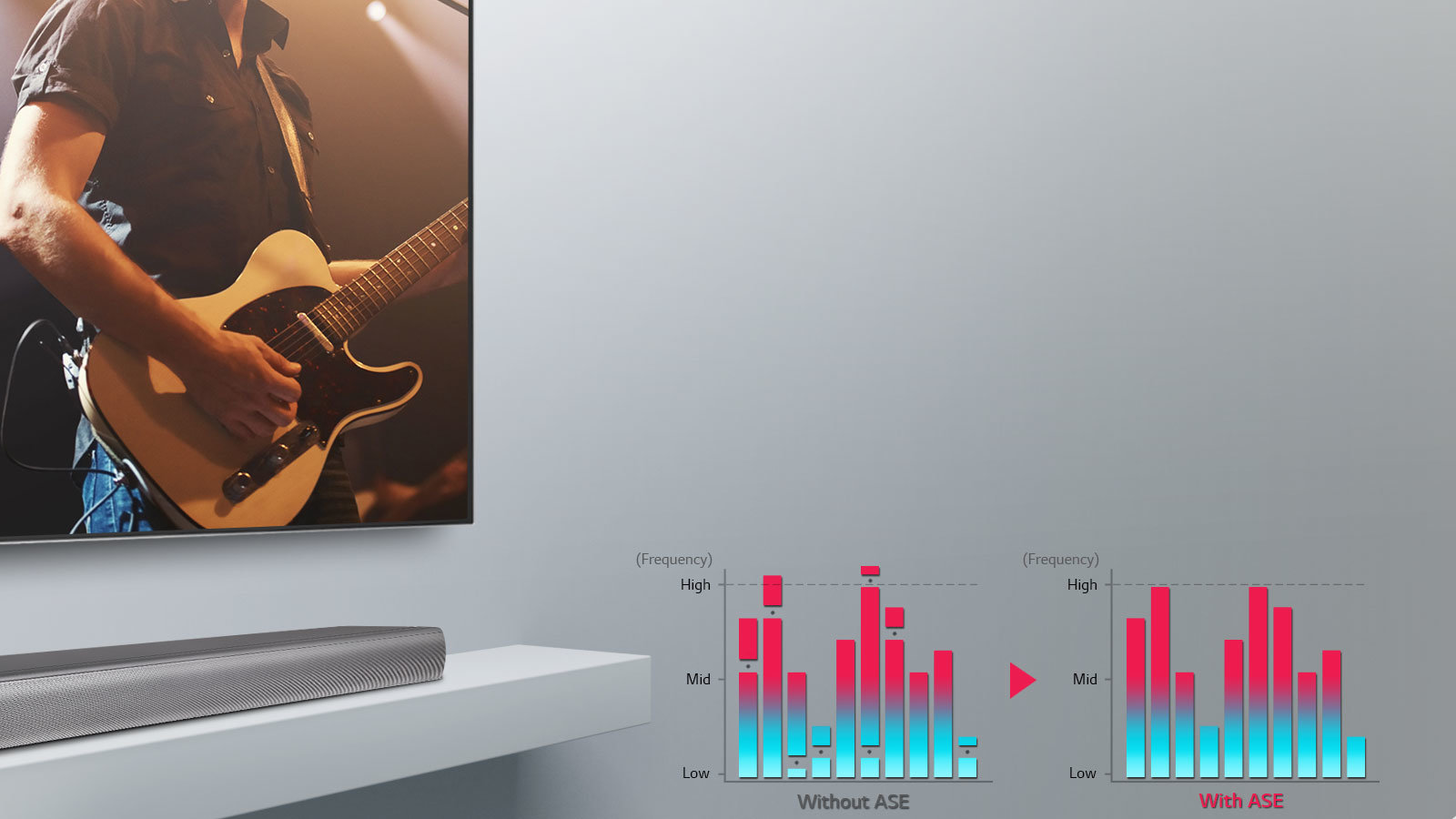 LG Auto Sound Engine optymalizuje dźwięk przy każdym poziomie głośności i cały czas precyzyjnie kontroluje częstotliwość. W ten sposób zapewnia odpowiedni balans dźwięku bez względu na głośność.
