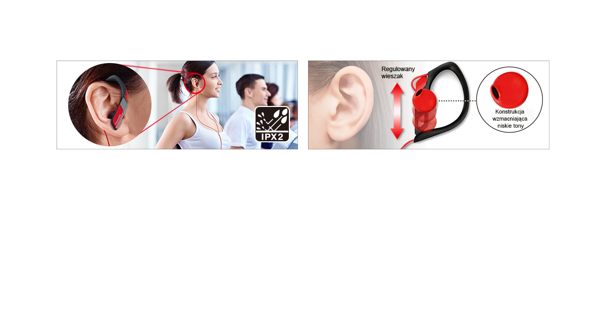 Klips słuchawek HS34 na uchu i przewodzie przechodzi za uchem, więc nie spadną one podczas ćwiczeń, a hałas związany z dotykaniem palcami jest zminimalizowany, zapewniając znakomitą jakość słuchania. Ponieważ słuchawki HS34 są odporne na działanie wody (odpowiednik IPX2*), świetnie nadają się do zastosowań sportowych.