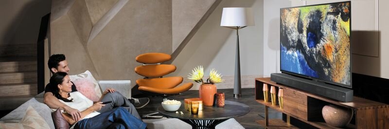Nie potrzebujesz dodatkowego subwoofera aby cieszyć się głębokim i czystym basem. Dzięki Soundbarom Sound+ z wbudowanym głośnikiem niskotonowym i technologią Distortion Cancelling, usłyszysz każdy detal obrazu. Poznaj soundbar o wysokiej jakości dźwięku i designerskim wyglądzie. Stwórz idealny zestaw z telewizorem.