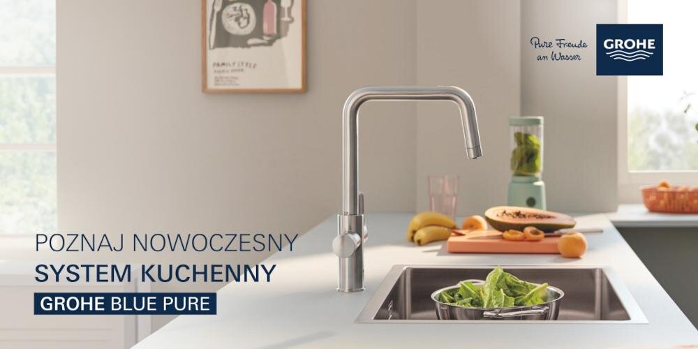 System kuchenny GROHE Blue Pure - to prawdziwa rewolucja w prowadzeniu zdrowego stylu życia. System zapewnia czystą wodę, która jest bogatym źródłem cennych minerałów, które są niezbędne dla zdrowia Twojego organizmu, takich jak: potas, magnez i sód. Dzięki wydajnym filtrom - jesteś pewien, że pijesz czystą i zdrową wodę, która nie tylko wybornie smakuje, ale także wspomaga prawidłowe funkcjonowanie Twojego organizmu!