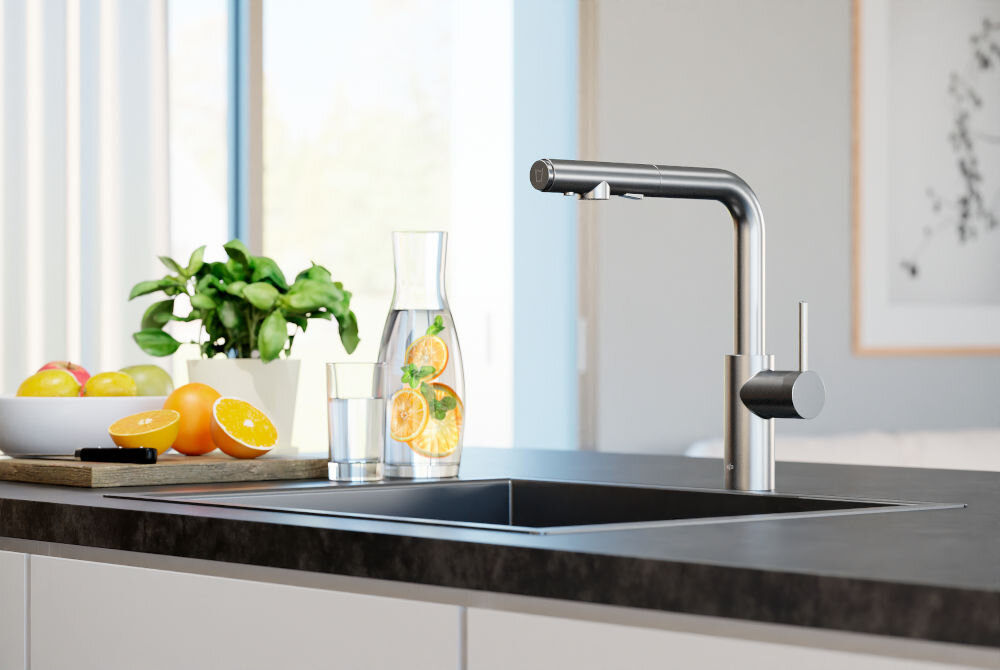 Baterie kuchenne KFA Duero Pure kryją wewnątrz 2 oddzielne kanały: dla wody filtrowanej i niefiltrowanej, co gwarantuje, że nie mieszają się one ze sobą. Zamontowany pod zlewem filtr oczyszcza przepływającą przez niego wodę, dostarczając ją wprost „do szklanki”. W baterii Duero Pure Basic Pull-Out funkcja filtrowania wody uruchamiana jest przyciskiem z przodu wylewki.