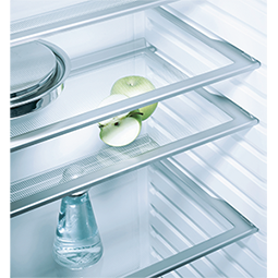 | WYTRZYMAŁE PÓŁKI Półki chłodziarki są wykonane z wytrzymałego, bezpiecznego szkła. Dzięki temu można na nich przechowywać nawet najcięższe produkty. |