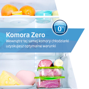 Komora zero To jedna lub dwie półki w części chłodzącej tuż nad szufladami na warzywa i owoce, do których nawiewane jest chłodzone powietrze w taki sposób, aby wewnątrz panowała temperatura ok 0˚C. Tutaj warto przechowywać produkty, które lubią niską temperaturę: świeże mięso, świeże ryby, nabiał czy wędliny. Dodatkowo zapewnia ona znacznie wyższy poziom wilgoci niż na innych półkach wewnątrz chłodziarki. Panują tam optymalne warunki do przechowywania np. surowego mięsa czy ryby. Korzyść: Wewnątrz tej samej komory chłodziarki uzyskujesz optymalną temperaturę i wilgotność idealną do przechowywania np. surowego mięsa czy ryby. Twoja ryba i mięso będą soczyste i długo świeże, a zapachy nie będą przedostawać się do innych części chłodziarki. |