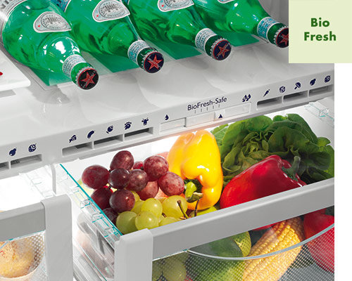Obie szuflady BioFresh są płynnie wysuwane na najwyższej jakości szynach teleskopowych. Pozwala to ocenić ich zawartość i zaplanować jak najlepsze ułożenie produktów. Zgodnie z własnymi przyzwyczajeniami szklaną półkę znajdującą się pod półką na butelki można użyć do ustawiania różnych pojemników lub kubeczków.