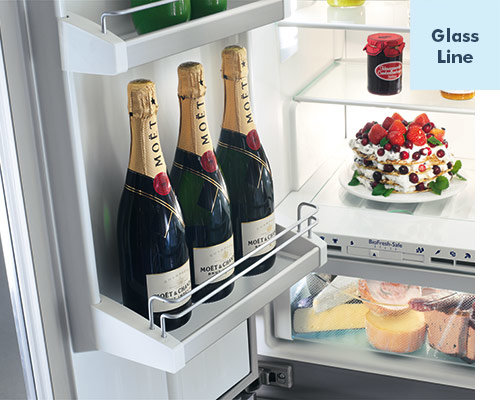 Wnętrze urządzeń wyposażono w półki GlassLine, wykonane z łatwego do mycia szkła hartowanego, wykończone najwyższej jakości stalą szlachetną. Dwuczęściową szklaną półkę można podzielić, wsuwając jedna pod drugą, tym samym uzyskując przestrzeń dla wysokich pojemników.