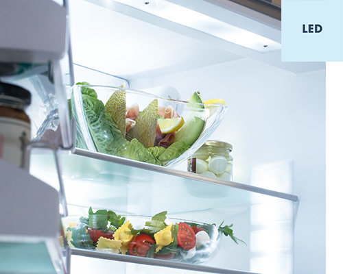 Urządzenie z serii PremiumPlus jest wyposażone w kolumny oświetleniowe LED, zintegrowane po obu stronach wnętrza. Satynowane obudowy kolumn emitują przyjemne i wysokowydajne światło. Jednocześnie kolumny umożliwiają ustawianie szklanych półek na różnych wysokościach. Dodatkowe, płaskie oświetlenie sufitowe LED zapewnia równomierne światło w chłodziarce.