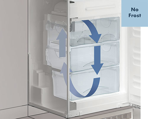 Urządzenia z technologią NoFrost zapewniają profesjonalną jakość chłodzenia oraz niezawodną, długotrwałą świeżość przechowywanej żywności. Schłodzone powietrze obiegowe zamraża produkty, przy jednoczesnym odprowadzaniu wilgoci na zewnątrz. Dzięki temu w zamrażarce nigdy nie ma lodu, a produktów nie pokrywa szron.