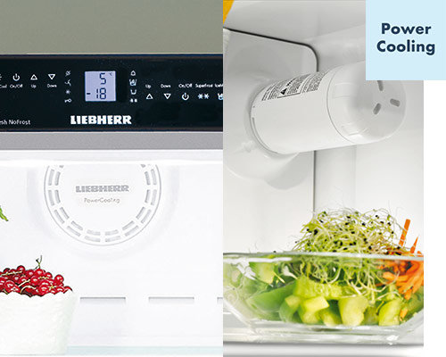 Wysoka wydajność systemu wentylacyjnego PowerCooling zapewnia szybkie schłodzenie świeżo umieszczonych produktów oraz utrzymanie zadanej temperatury wnętrza. Wentylator wyłącza się w chwili otwarcia drzwi, oszczędzając tym samym cenną energię. Łatwy do wymiany filtr z węglem aktywowanym FreshAir, zintegrowany w obudowie wentylatora, utrzymuje optymalną jakość powietrza.