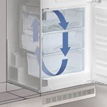 Technologia FrostSafe Za sprawą technologii FrostSafe niezwykle wysokie i wyjmowane szuflady są zamknięte ze wszystkich stron. To znacznie obniża straty zimna podczas otwierania drzwi urządzenia. Przezroczyste fronty szuflad umożliwiają optymalny przegląd przechowywanych produktów. |