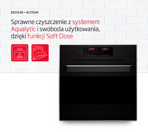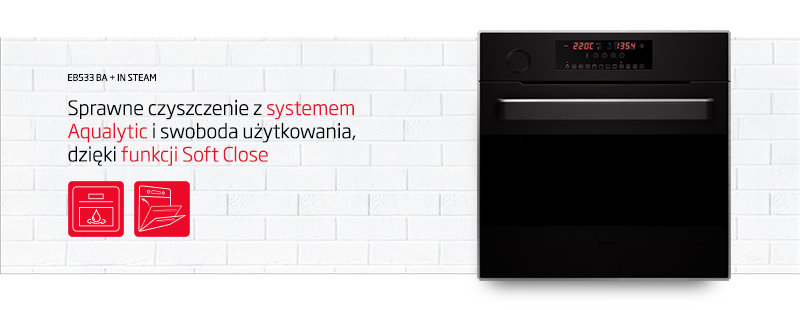 Teraz nie musisz już spędzać czasu na czyszczeniu piekarnika. Wystarczy że wykorzystasz funkcję System Aqualytic. To dzięki niej 250 ml wody wlanej na blachę po włączeniu programu oczyszcza powierzchnię piekarnika, pokrytą gładką emalią AquaRealEasy. W emalię tę nie wnikają cząstki brudu, dlatego szybko można usunąć zabrudzenia po przygotowaniu różnorodnych potraw.