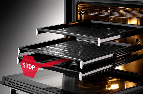 Bezpieczeństwo w kuchni jest ważne - zwłaszcza gdy w pobliżu są dzieci. Właśnie dlatego stworzyliśmy Probaby System, na który składa się mechaniczna blokada drzwiczek, układ kanałów wentylujących oraz wentylator chłodzący i prowadnice teleskopowe z funkcją STOP, które ułatwiają wkładanie blach w skrajnie wysuniętej pozycji.