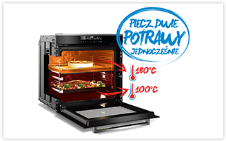 Technologia Split&Cook pozwala podzielić piekarnik przy użyciu specjalnego separatora, dzięki któremu pieczenie dwóch potraw jednocześnie staje się możliwe. Od teraz możesz przygotować danie główne i deser w jednym piekarniku, ustawiając różne temperatury i czasy pieczenia. Uwolnij swoją kreatywność!