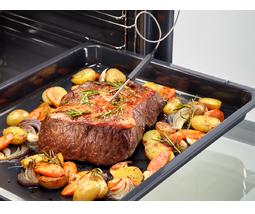 Łatwe pieczenie, dzięki termosondzie z funkcją automatycznego wyłączenia Najlepszym sposobem na sprawdzenie, czy pieczona potrawa osiągnęła już właściwą temperaturę, jest użycie termosondy – pozwala ona niemal zajrzeć do jej wnętrza. Podczas pieczenia mięsa można wybrać ustawienie „lekko”, „średnio” lub „dobrze wypieczone”, aby urządzenie zasygnalizowało, że potrawa jest już gotowa i wyłączyło piekarnik. |