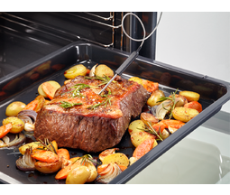 Łatwe pieczenie, dzięki termosondzie z funkcją automatycznego wyłączenia Najlepszym sposobem na sprawdzenie, czy pieczona potrawa osiągnęła już właściwą temperaturę, jest użycie termosondy – pozwala ona niemal zajrzeć do jej wnętrza. Podczas pieczenia mięsa można wybrać ustawienie „lekko”, „średnio” lub „dobrze wypieczone”, aby urządzenie zasygnalizowało, że potrawa jest już gotowa i wyłączyło piekarnik. |