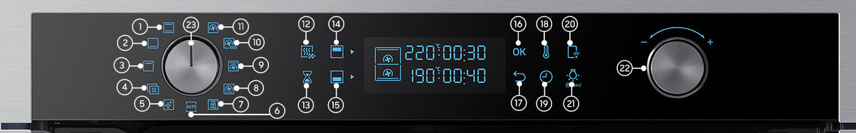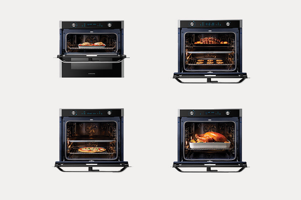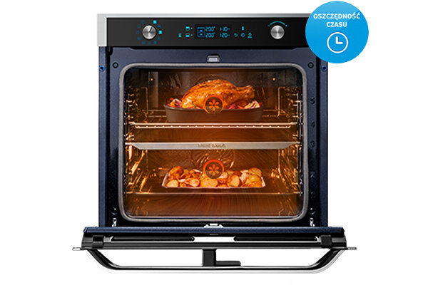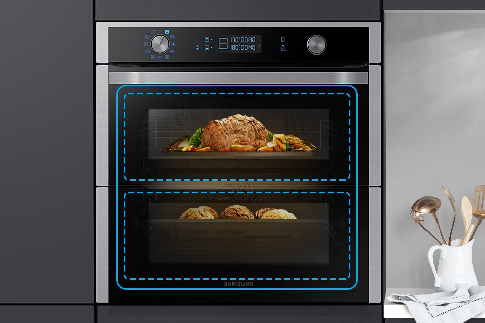 Samsung Dual Cook™ posiada dwa niezależne termoobiegi, by w obydwu komorach zapewniać idealne warunki pieczenia. Cały piekarnik rozgrzewa się błyskawicznie. Przyrządzane dania pieką się w odpowiedniej dla siebie temperaturze. Przygotuj dwa dania równocześnie, jedno duże danie w całym piekarniku lub jedno mniejsze danie, używając tylko jednej komory piekarnika.