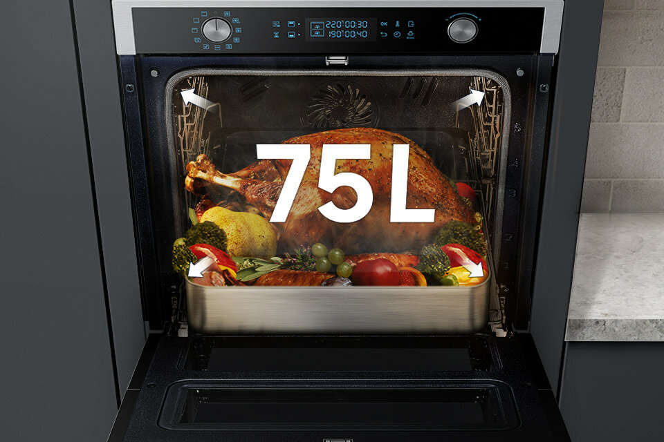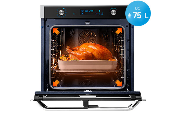 Piekarnik Samsung to aż 75 litrów pojemności. Oznacza to więcej możliwości pieczenia. Możesz teraz przygotować kilka dań w tym samym czasie lub jedno naprawdę duże danie. Idealnie sprawdzi się przy organizowaniu np. przyjęcia świątecznego. Wygoda użytkowania, która pozwala na więcej.