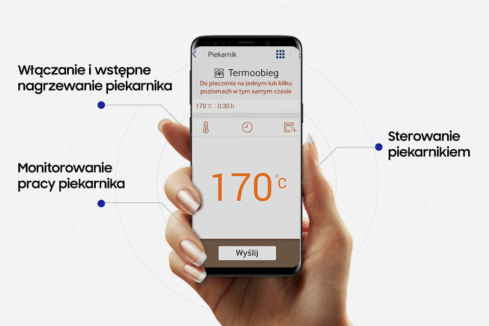 Należy użyć aplikacji Samsung Smart Things (wybrać tam opcję "Piekarnik" na liście urządzeń). Aplikacja dostępna na smartfonach z systemem Android oraz IOS.