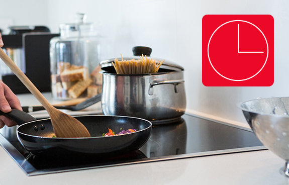 Timer umożliwi Ci dokładne zaprogramowanie czasu trwania gotowania na danym polu (do 99 minut). Po określonym wcześniej czasie pracy, pole wyłącza się, a wcześniej informuje Cię o zakończeniu gotowania specjalnym sygnałem dźwiękowym. To nie wszystko! Funkcja dostępna jest na jednym lub czterech polach niezaleźnie, a Timer może także działać jako minutnik.