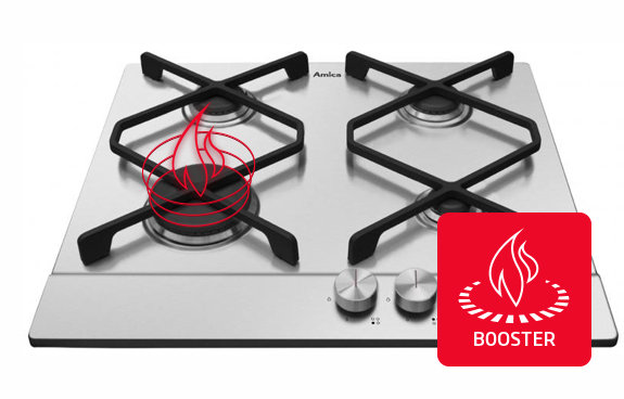 Często gotujesz w dużych naczyniach? Zyskaj wyjątkowy palnik Booster, który gwarantuje równomierne ogrzanie nawet dużego garnka czy patelni, dzięki swej powiększonej powierzchni. Co więcej, został wyposażony w zwiększoną moc (4kW), co znacznie skróci czas przygotowywania jedzenia.
