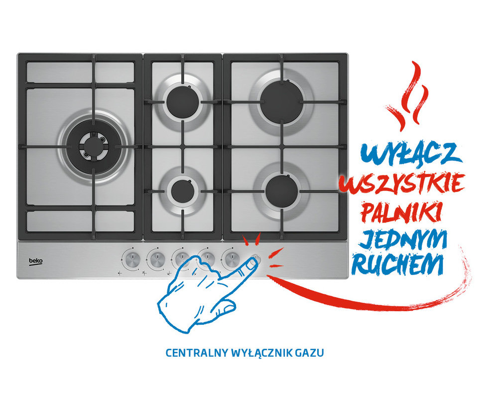 Główny wyłącznik Funkcja pozwala na jednoczesne wyłączenie wszystkich zapalonych palników. Jest szczególnie przydatna na przykład podczas wyjazdu na wakacje, wtedy dla bezpieczeństwa możesz łatwo wyłączyć dopływ gazu do płyty. Może również posłużyć jako blokada przed dziećmi. |