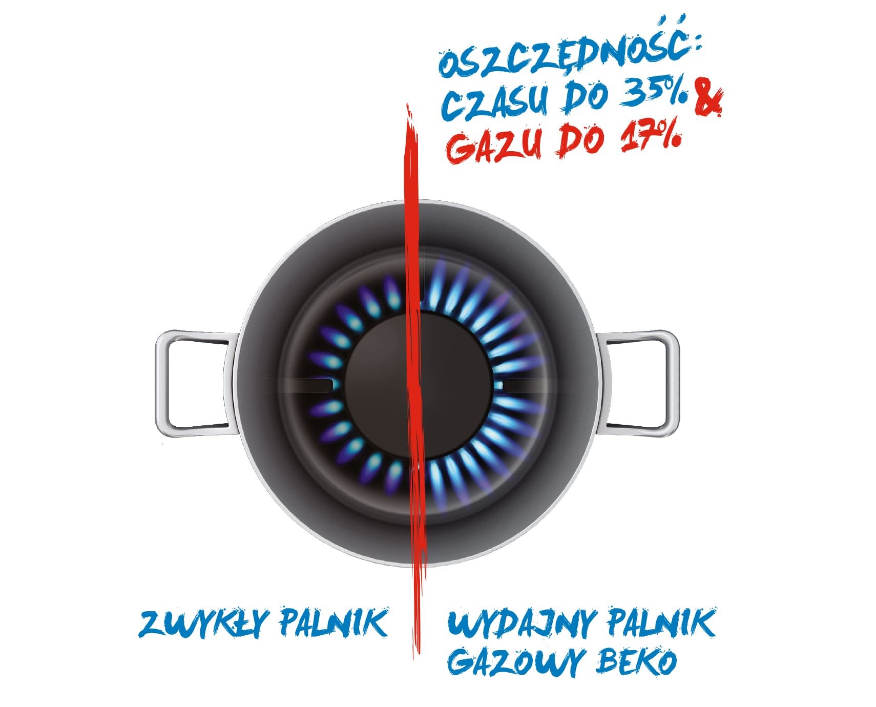| Wydajne palniki gazowe | Oszczędzaj wydajnie Specjalnie zaprojektowana konstrukcja palników pozwoliła na znaczne zwiększenie ich wydajności. Dzięki temu zaoszczędzisz do 35% czasu i do 17% zużytego gazu podczas gotowania ulubionych potraw. |