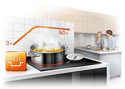 Dzięki automatycznej funkcji gotowania wody już nigdy nie przypalisz żadnego naczynia. Technologia indukcyjna Samsung w inteligentny sposób wykrywa temperaturę wrzenia wody i dźwiękiem sygnalizuje jej osiągnięcie. Po usłyszeniu sygnału dźwiękowego wystarczy włożyć do garnka makaron lub inne składniki.